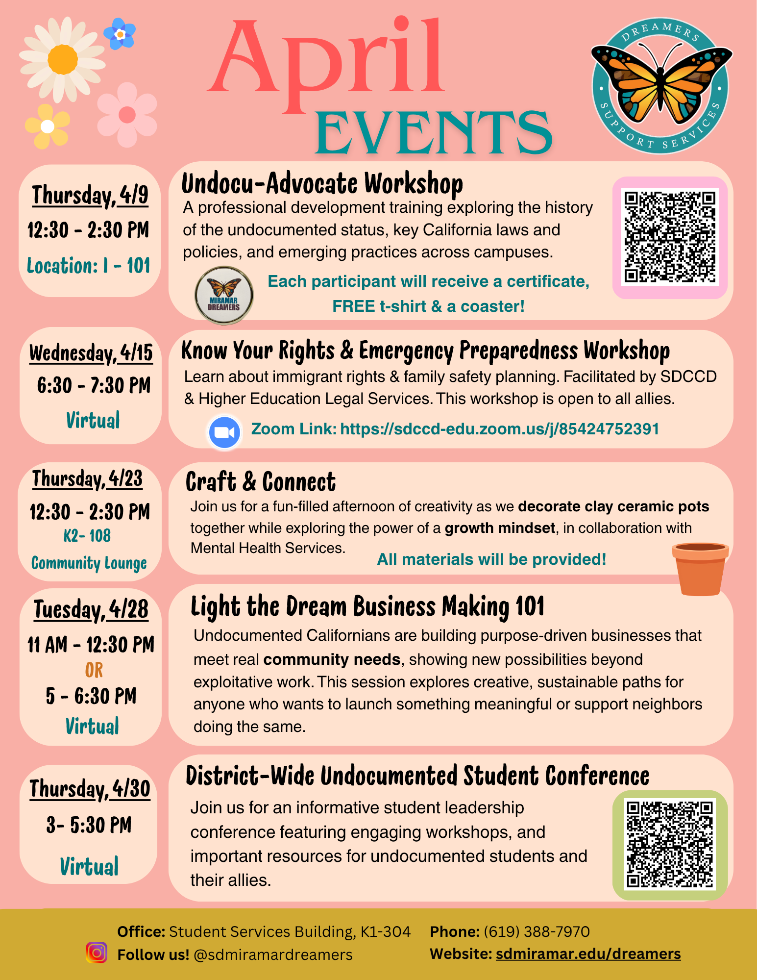 The Miramar College Dreamers Support Office produces many workshops and events to both inform and entertain our undocumented and immigrant students and their family members. Our workshops and engagement events are always FREE and open to all students regardless of status. Some events may require pre-registration, so read the descriptions.