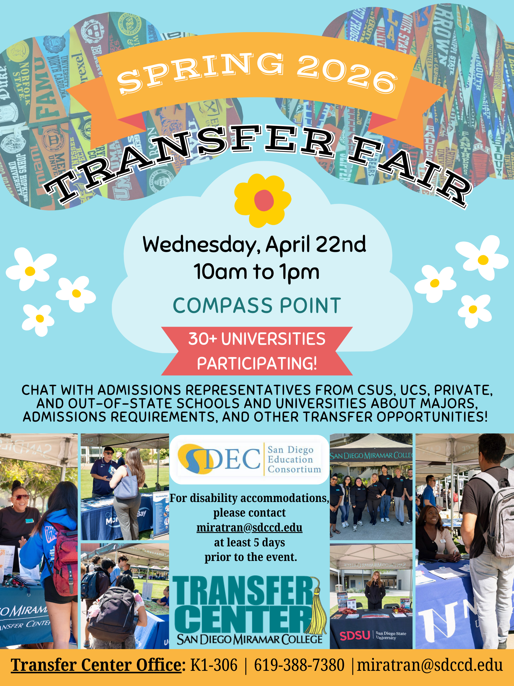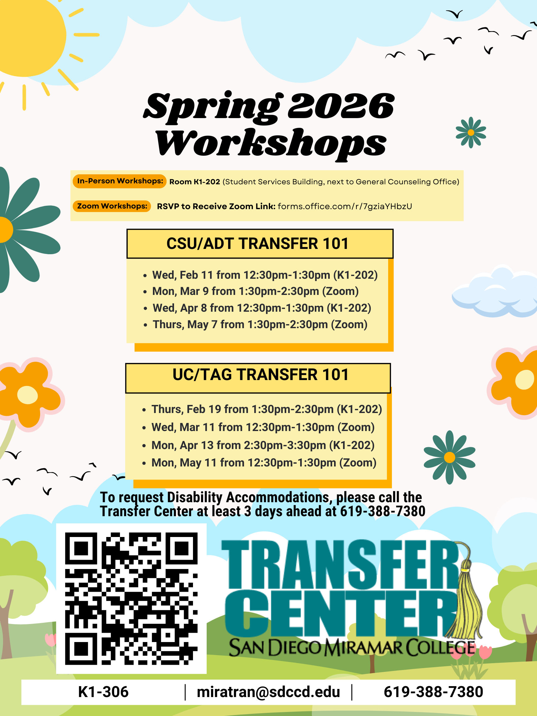 To sign up for an application workshop below, please use this link to sign up for a transfer workshop (not an application workshop) please use this link or call (619) 388 7380, email [email protected], or stop by K1-306