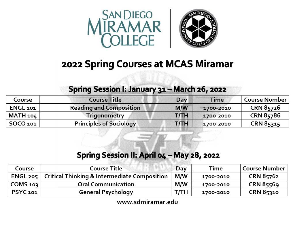 San Diego Miramar College offers a variety of general education courses aboard Marine Corps Air Station Miramar (MCAS). These courses are open to military personnel, their families, and all Miramar College students (For more information about civilian access please read "Getting on Base (Civilian)".