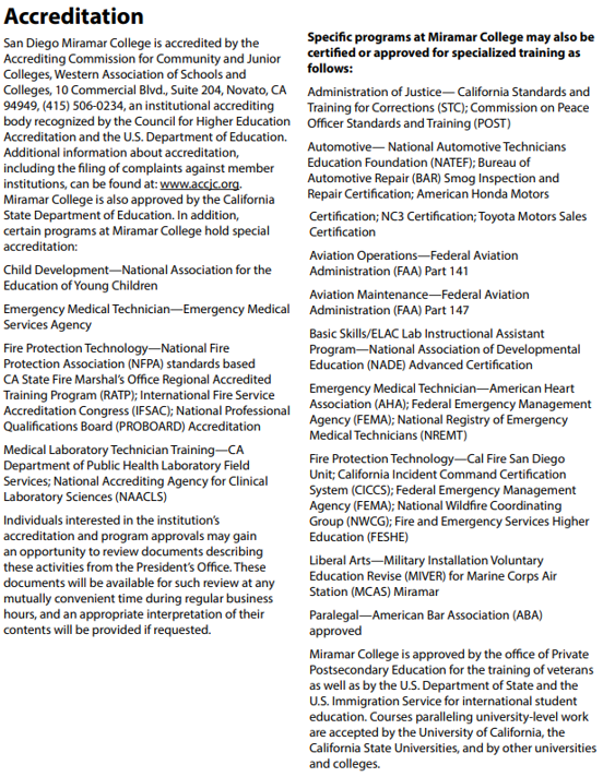 San Diego Miramar College refrains from providing any commission, bonus, or other incentive payment based directly or indirectly on securing enrollments or federal financial aid (including Tuition Assistance funds) to any persons or entities engaged in any student recruiting, admission activities, or making decisions regarding the award of student financial assistance. Additionally, San Diego Miramar College refrains from high-pressure recruitment tactics such as making multiple unsolicited contacts, including contacts by phone, email, or in-person, and engaging in same-day recruitment and registration for the purpose of securing Service member enrollments.