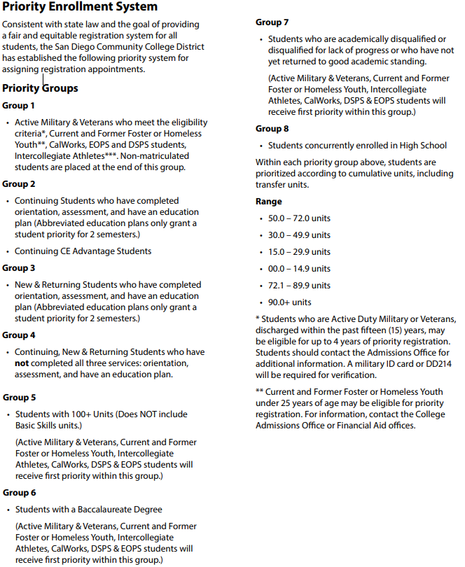 Be sure to stop by Admissions on Campus or the MCAS Miramar College Office to verify your military service for priority registration purposes. You may show your Active Duty Military ID card in person, or you may also email a copy of both your most recent LES statement and basic orders to MiramarVeterans@sdccd.edu. Please include your 10-digit student ID number in all email correspondences. For Veteran Students, you may submit a copy of your DD-214 (member 4 page) to verify your military service. Feel free to reference the Priority Enrollment System below which will show you what priority group you will be placed into: